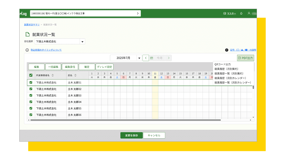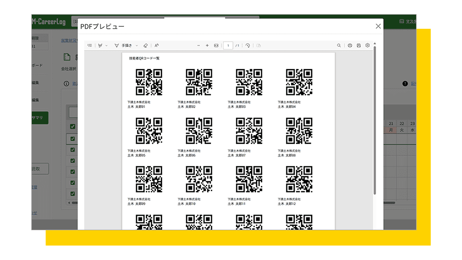 就業状況一覧画面から、選択した技能者のQRコードをPDFで出力できます。印刷したPDFを管理者が現場に持参し、入場した技能者のQRコードを読み取って入場管理したり、各技能者に配布して入場管理することも可能です。