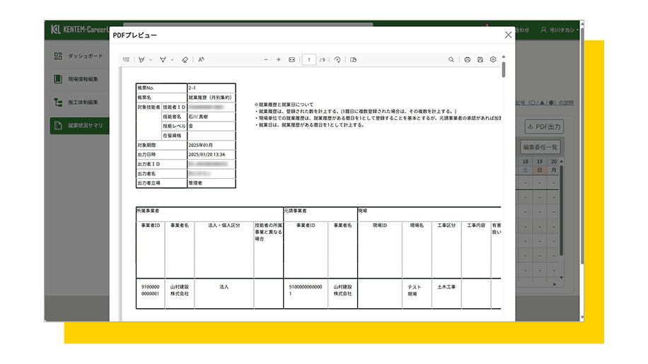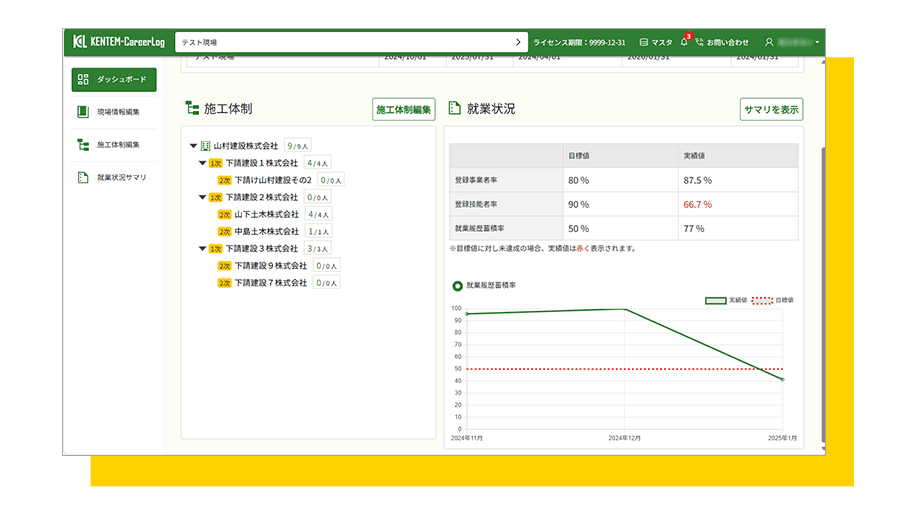 登録された情報をダッシュボード上に表示し、「施工体制情報」「登録事業者・技能者率、就業履歴蓄積率」を可視化できます。