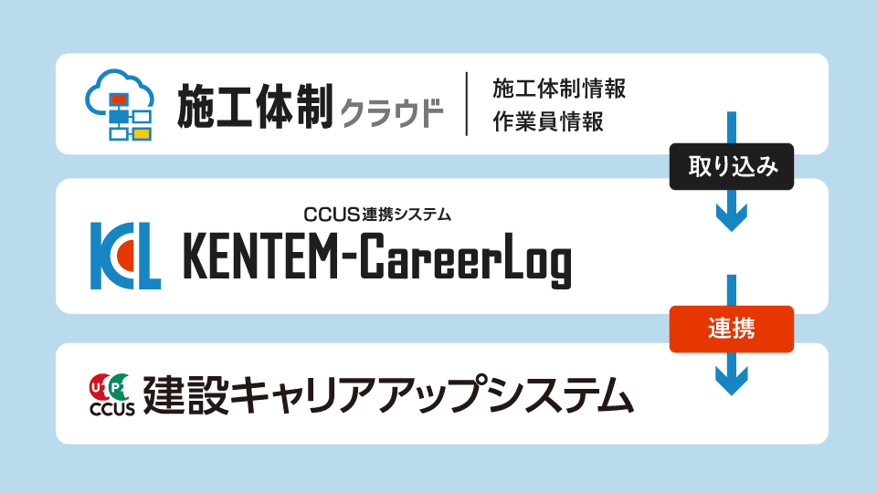 「施工体制クラウド」で登録した「施工体制情報」「作業員情報」を「KENTEM-CareerLog」に取り込むことでCCUSへの情報登録作業が完了します。公共工事で、提出が必須になる施工体制台帳の情報と連携することでさらなる業務の効率化を追求します。